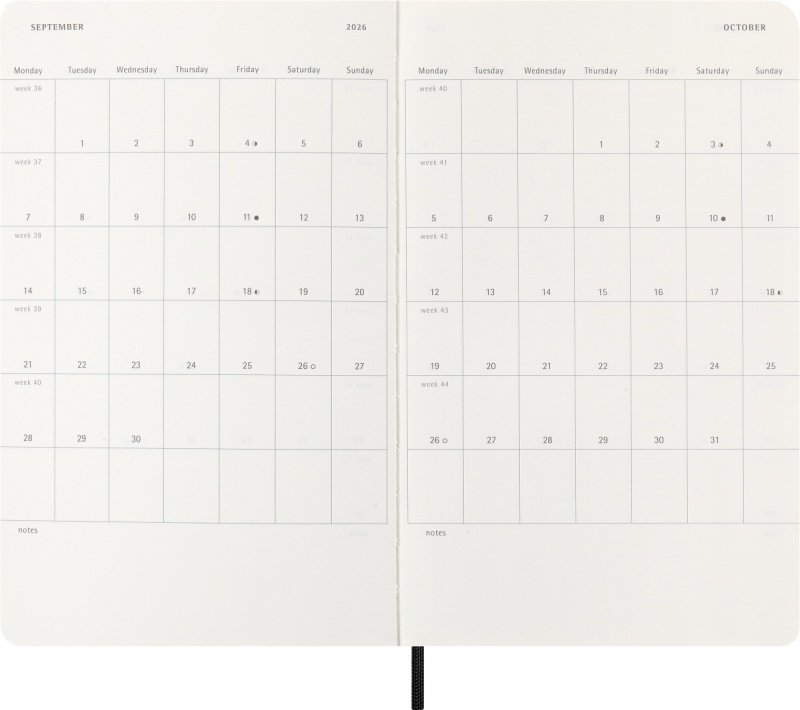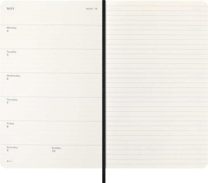 Siedem dni tygodnia jest przedstawionych po lewej stronie, a po prawej stronie znajduje się strona w linie przeznaczona na notatki, przypomnienia i przemyślenia. Ten praktyczny układ łączy planer i notatnik, dając Ci to, co najlepsze z obu światów w 2026 roku.