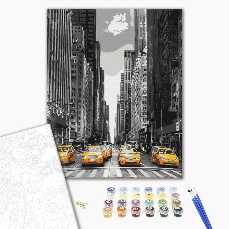 zestaw farb akrylowych, ponumerowanych zgodnie z numerami kolorów, na które podzielone jest płótno