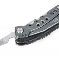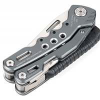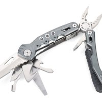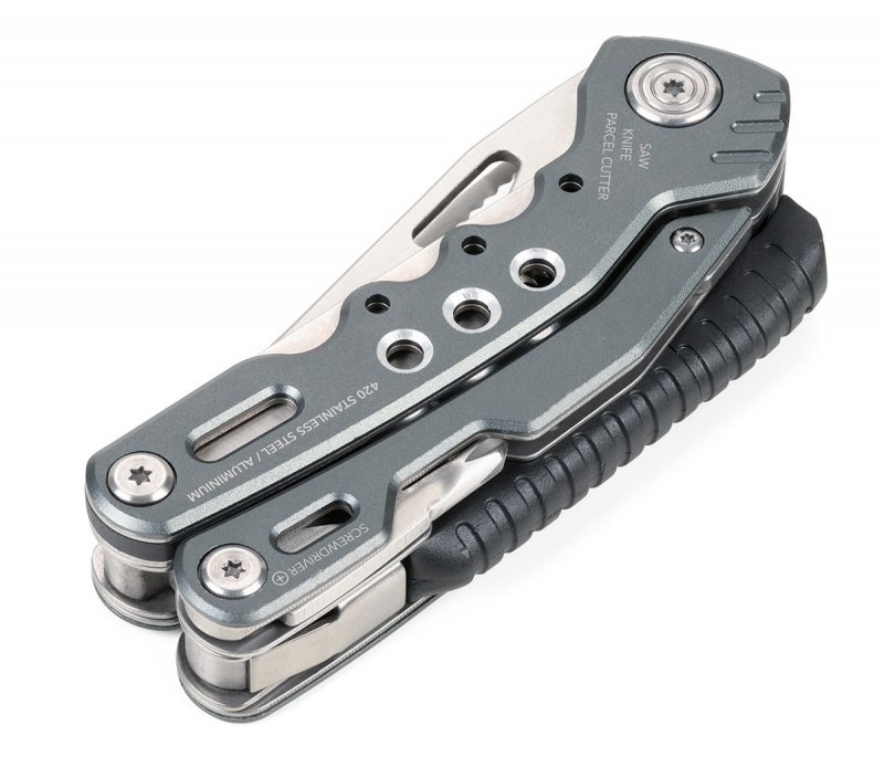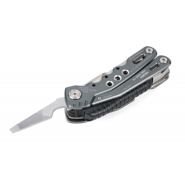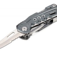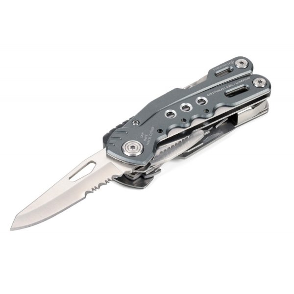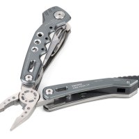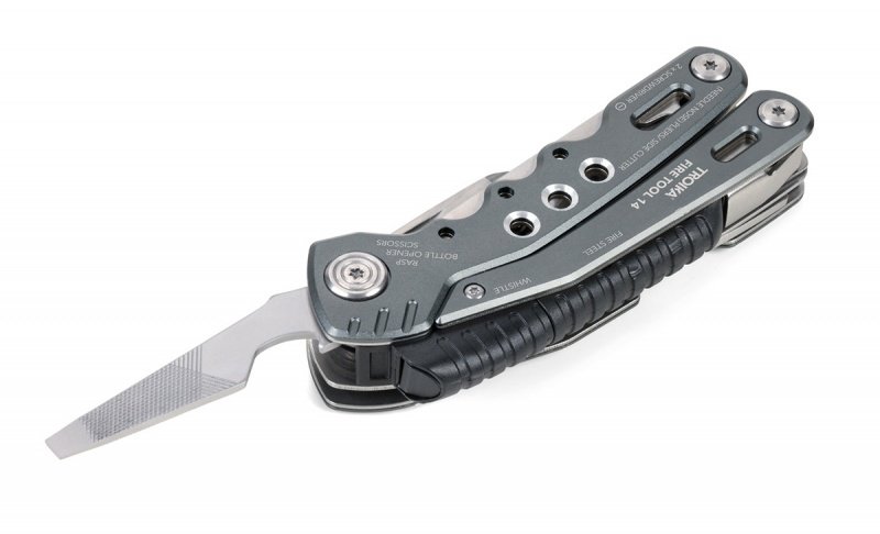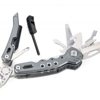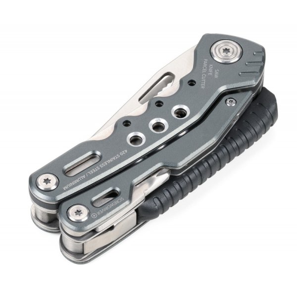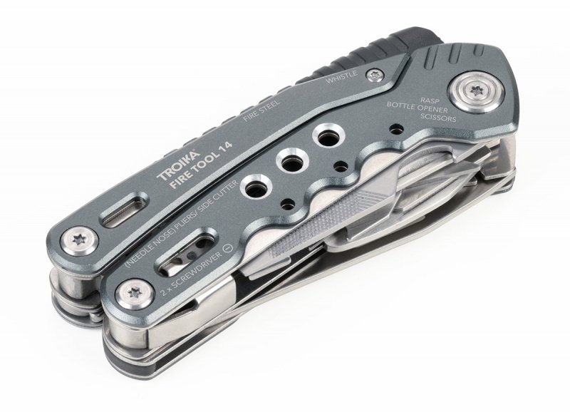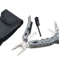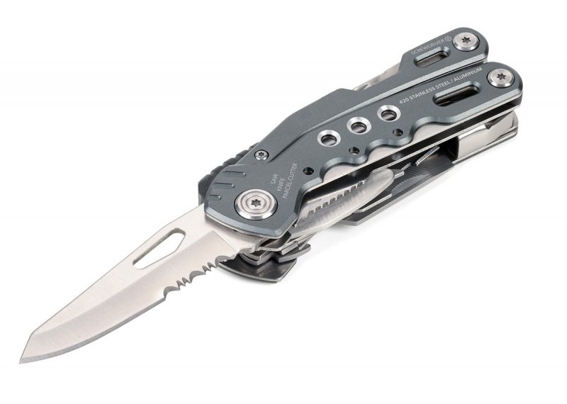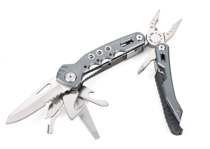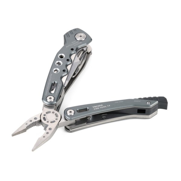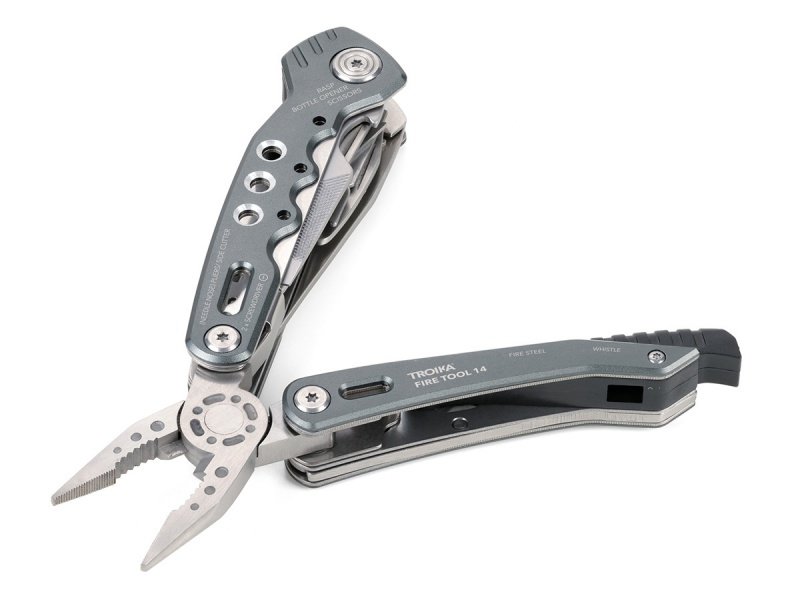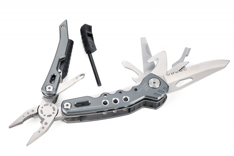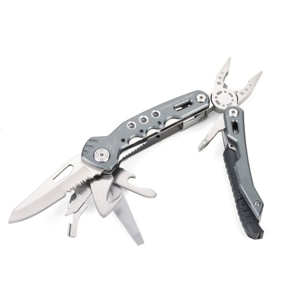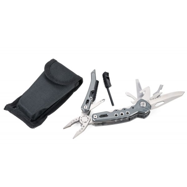 14 funkcji: szczypce wydłużone, szczypce klasyczne, obcinacz boczny, nóż, piła, nożyczki, nożyk do paczek, śrubokręty płaskie w 2 rozmiarach, otwieracz do butelek, śrubokręt krzyżakowy, pilnik, krzesiwo, gwizdek sygnalizacyjny