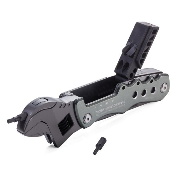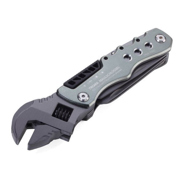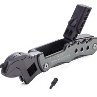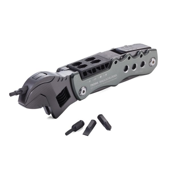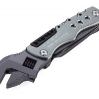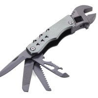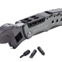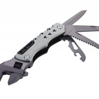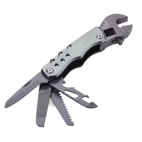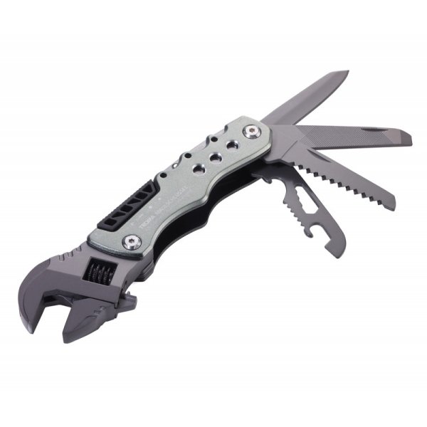 12 funkcji: klucz nastawny (angielski), nóż, piła, pilnik, otwieracz do butelek, otwieracz do puszek, szeroki śrubokręt płaski, klucz sześciokątny (4 rozmiary), 4 końcówki do narzędzia (płaska, krzyżakowa, nasadowa, sześciokątna)
